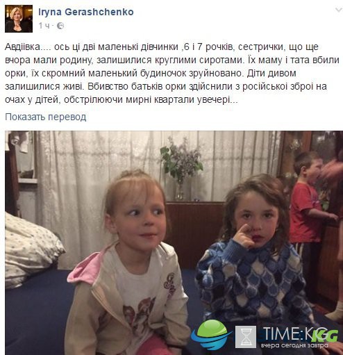 "Эти две маленькие девочки, которые еще вчера имели семью, стали сиротами. Убийство их родителей орки осуществили из российского оружия прямо на глазах у детей, обстреливая мирные кварталы вечером", - прокомментировала трагедию Ирина Геращенко.