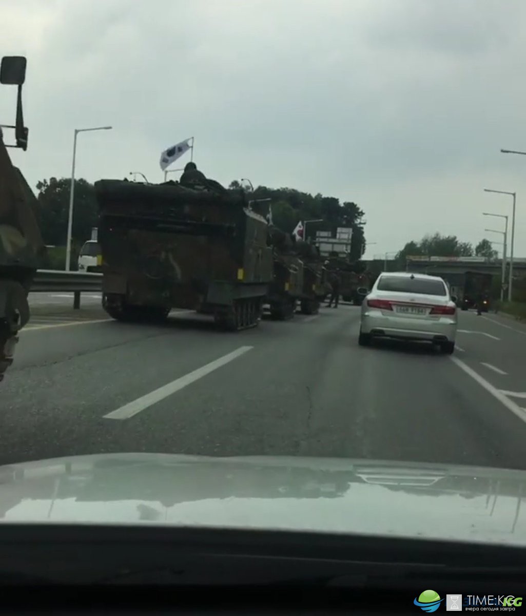 Огромная колонна южнокорейской военной техники, которая движется в северном направлении замечена неподалёку от Сеула. Очевидцы сделали множество фотографий тяжёлой техники.