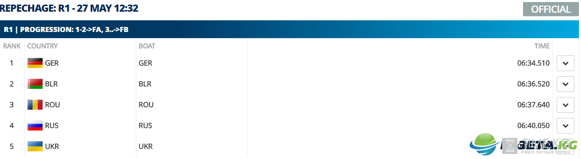 Двойка парная в составе Ольги Гурсковской и Анны Концевой пришла последней в квалификационном раунде со временем 07:13.060 мин, однако все равно сумела пройти в финал В, где будет соревноваться со сборными России, Великобритании и Франции.