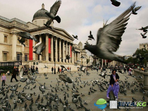 Сегодня запрещено кормить голубей на Трафальгарской площади. Чтобы уменьшить их численность, используются специально обученные хищные птицы, которые пока неплохо справляются со своей задачей.