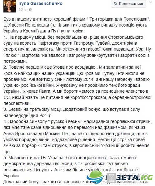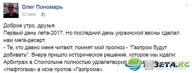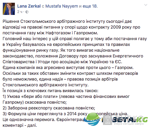 В том смысле, что данная «пэрэмога» это — «евроинтеграция в силе». Мол, единственной компанией, которая агрессивно выступала против поставок газа в Украину на европейских принципах — «Газпром», но её за это Стокгольмский арбитражный суд низверг в ад.