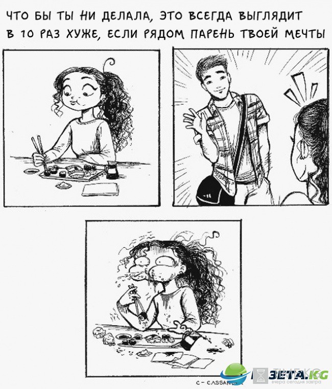 Румынская художница Кассандра Калин (Cassandra Kalin) создает комиксы, в которых презабавно изображает каждодневные женские проблемы. «Мне очень нравится смеяться над своей неловкостью, над своими нелепыми проблемами», — пишет она. Согласитесь, что с такой философией и правда легче шагать по жизни.