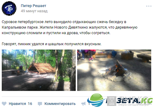 Шел третий день лета: В Петербурге местные жители сожгли беседку в парке, чтобы согреться