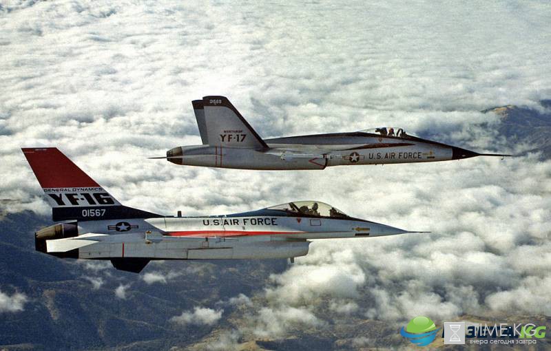 Одновременно с прототипом YF-16 на авиабазе Эдвардс испытывался его двухмоторный конкурент YF-17. В дальнейшем этот самолет, проигравший F-16 в ВВС, превратился в весьма успешный палубный истребитель F / A-18 Hornet.