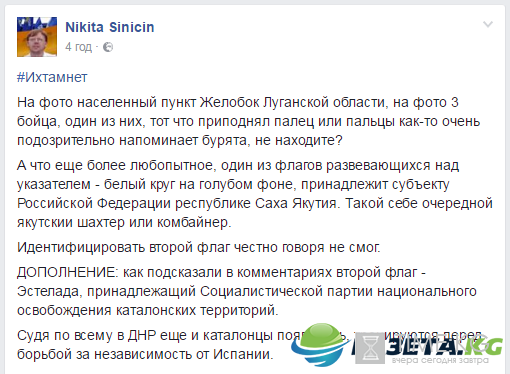 Журналист обнародовал фото трех бойцов стоящих на фоне таблички с названием города Жолобок, якобы в Луганской области. Знак украшен двумя флагами, один был опознан журналистом сразу, это якобы флаг республики Якутия, второй флаг, по подсказкам знающих читателей, принадлежит каталонской Социалистической партии национального освобождения.