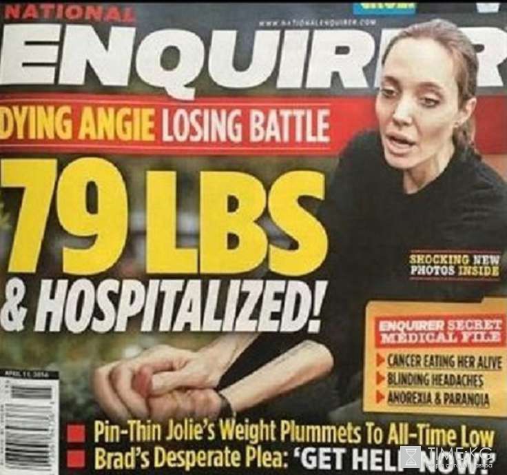 Издательство National Enquirer одним из первых опубликовало сведения о том, что Энджи «проигрывает битву». У звезды нешуточные проблемы со здоровьем, так рассказывается в публикации. Официального подтверждения о том, что у Анджелины анорексия пока не было. Однако на обложке National Enquirer размещен снимок актрисы, на котором она действительно выглядит измождённой.
