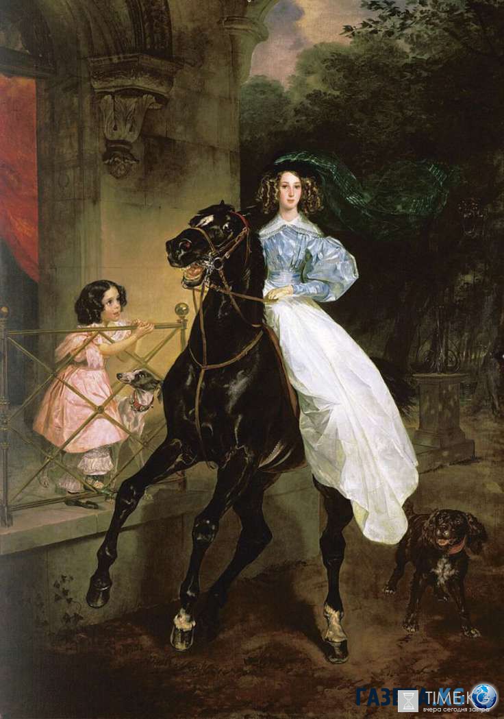 «Всадница» Брюллова — блистательный парадный портрет, в котором роскошно все: и яркость красок, и пышность драпировок, и красота моделей. На нем изображены две девочки, носившие фамилию Пачини: старшая Джованина сидит на лошади, младшая Амацилия смотрит на нее с крыльца. Картину Карлу Брюллову — своему многолетнему возлюбленному — заказала их приемная мать, графиня Юлия Павловна Самойлова, одна из красивейших женщин России и наследница колоссального состояния. Повзрослевшим дочерям графиня гарантировала большое приданое. Но получилось так, что к старости она практически разорилась, и тогда приемные дочери Джованина и Амацилия через суд взыскивали у графини обещанные деньги и имущество.
