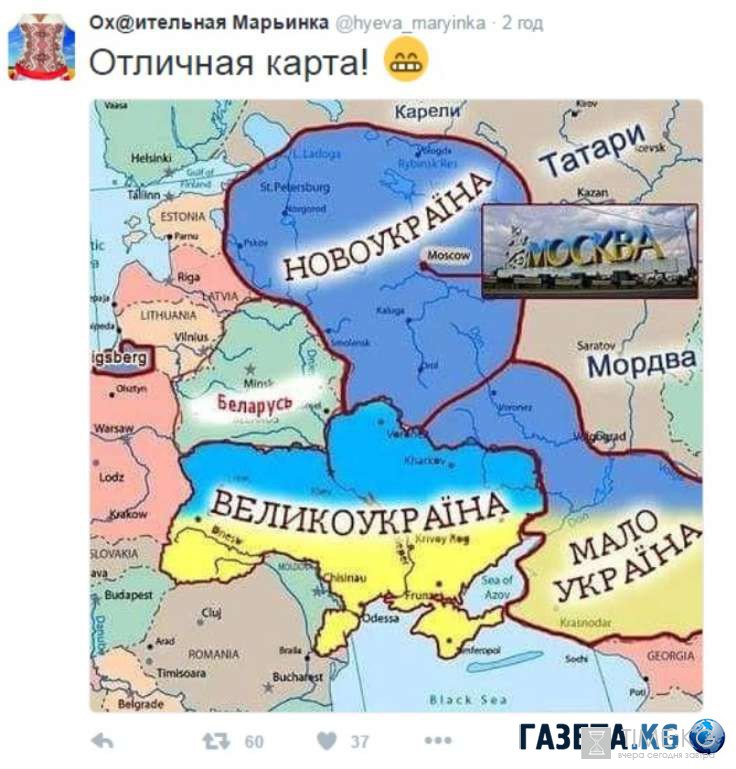 Новости Украины сегодня 14 05 2016: пользователи соцсетей «пересмотрели» границы украинских государств-соседей и опубликовали шуточную карту новых территорий. Территорию РФ отнесли к «Новоукраине» и «Малоукраине» со столицей в Москве.