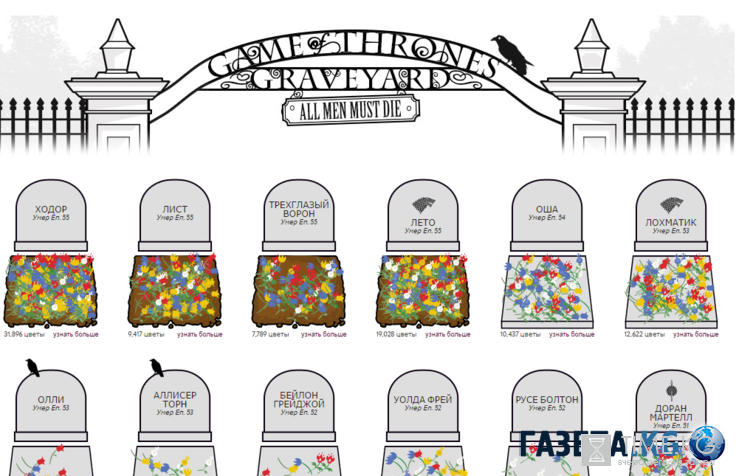 Поклонники «Игры престолов» уже потеряли счёт погибшим персонажам – стоит только полюбить героя, как он (или она) обязательно гибнет. Очевидно, фанаты не смогли смириться с потерями, и решили хотя бы почтить память павших от пера Джорджа Мартина, автора саги «Песнь Льда и Пламени», по которой и был снят сериал. В интернете появился интересный сайт, на котором все игроманы могут возложить цветы на могилки любимым героям. Возложить в прямом смысле этого слова – все могилы снабжены кнопкой, кликнув на которую, можно положить цветочек.