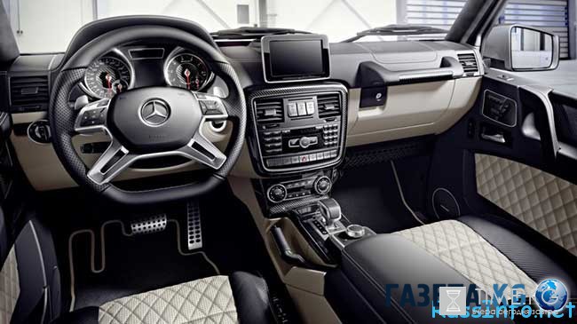 При прежнем ассортименте материалов отделки салон покоряет современностью, роскошью, красотой. Все это охватывает компоненты интеллектуальных помощников, представленных многофункциональным рулевым колесом в компании с кожаными и деревянными элементами, информативными оптитронными приборами. И некоторым предметам все же пришлось поменять свои черты, чтобы органично вписаться в салон. А под самых требовательных людей дизайнеры разработали персональный кузов Grand Edition. Так что комплектации и цены на Mercedes-Benz Gelandewagen 2016 тоже будут разными. Самому дорогому интерьеру причитается оформление на сидениях при помощи двухцветной кожи designo, вставок, воплощенных канадским ясенем с орехом для «торпеды», а также хромированными элементами декора.