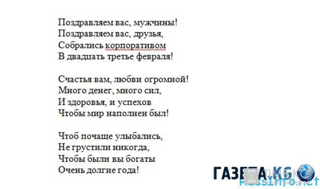 23 февраля считается первым корпоративным праздником года, поэтому к его празднованию обычно подходят ответственно (за два месяца напряженной работы после новогодних каникул офисные сотрудники успевают соскучиться по веселью). Безусловно, некоторых компаниях женская часть коллектива просто собирает мужчин в одном помещении, произносит вдохновляющую речь, которая может сопровождаться небольшим застольем, естественно, с вручением памятных подарков, после чего, все офисные сотрудники начинают выполнять свои трудовые обязанности, но назвать такой сценарий празднования слишком веселым точно нельзя. Сделать этот день запоминающимся поможет определенная развлекательная программа, и, желательно, для мужской части коллектива оставить ее в тайне до «часа Х». Никто не будет утверждать, что организация веселого офисного корпоратива не сопровождается определенными трудностями, ведь она требует и времени, и внимания, однако просто зачитать текст поздравления с 23 февраля 2016 года – это банально, хотя без составления стишков (или поиска готовых стихотворений в сети) обойтись все же не получится.