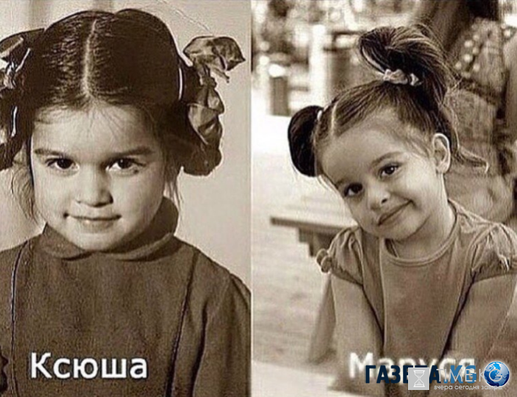 Ксения вложила в Instagram фотографию, на которой она объединила два снимка в один. Если не смотреть на одежду и прическу девочек наблюдается огромное сходство между ними.