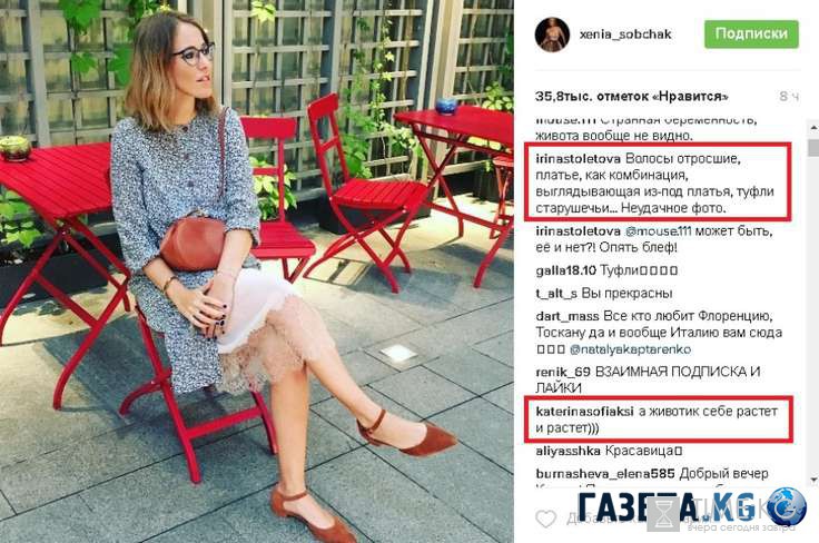 34-летняя Ксения Собчак показала на снимке любимое место отдыха, но фанаты, скорее всего, не заинтересовались оригинальной террасой, обстановкой и местностью. Больше всего их внимание было приковано к наряду знаменитости и ее внешности. Многие обсудили прическу Ксении, подметив, что «если она не красит отросшие корни волос, то значит точно беременна». Также фолловеров раздражала сумка на руках ведущей, поскольку она мешала им рассмотреть получше фигуру и наличие округлившегося животика. «Это интуитивная привычка всех беременных – держать что-то возле живота, прикрывая его», отмечают подписчики.