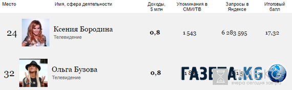 В список рейтинга попали и ведущие шоу «Дом2» телеканала «ТНТ», о которых в последнее время очень много написано новостей. Ольга Бузова уступила Ксении Бородиной восемь позиций, несмотря на то, что доходы у них одинаковые. Из 50 мест: Ольга на 32-м, а Ксения на 24-м.