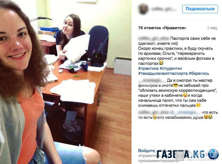 На своей страничке в Instagram две студентки Санкт-Петербургского института культуры решили опубликовать фото со своей практики. Девушки проходили практику в паспортном столе, и работа настолько впечатлила юных особ, что своими яркими впечатлениями они решили поделиться со своими друзьями.