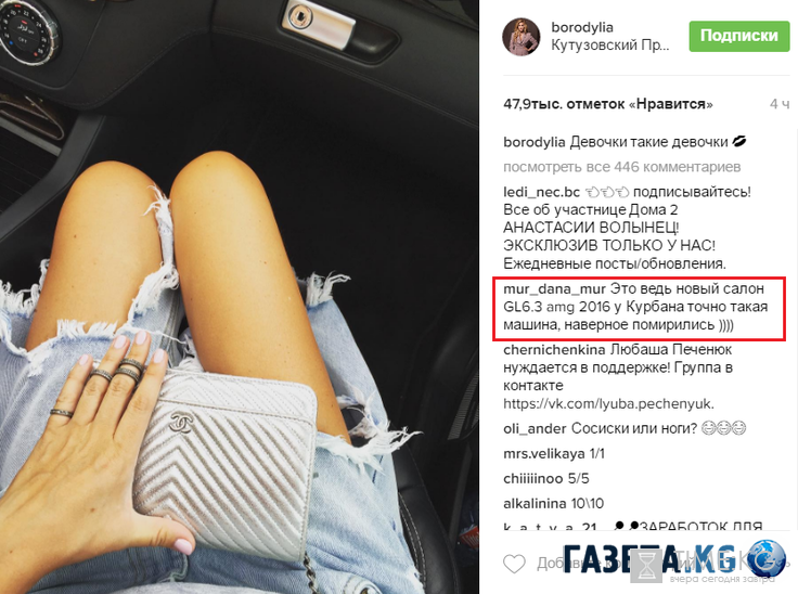 Незаурядное фото Ксении, на котором она продемонстрировала стройные ножки, вызвало не только обсуждение их худобы, но и прежде всего, был замечен антураж нового снимка телеведущей. Поклонники обратили внимание на то, что Ксения сидит на пассажирском кресле автомобиля, салон которого напоминает салон нового автомобиля Курбана Омарова. «Интрига опять интрига», подумали поклонники и выразили надежду, что их любимица всё же нашла в себе силы помириться с мужем.