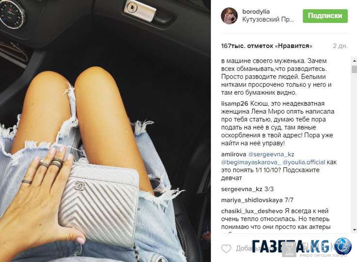 Одна из фотографий телеведущей, которую она опубликовала в своем микро-блоге, заставила поклонников усомниться в её честности. Ксения поместила фото своих ножек с новой сумочкой на коленях, но подписчиков поразило то, что Бородина сидит в машине Курбана Омарова. Этот факт неприятно удивил внимательных подписчиков девушки, ведь совсем недавно она посвятила бывшему мужу гневный пост, в котором обвинила его в изменах и гулянках.