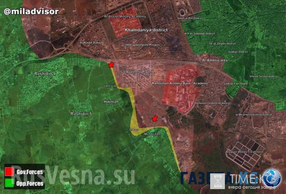 По мнению военных экспертов арабского агентства AMN, в случае, если проправительственные силы захватят лагерь Хадарат, то будет создан новый маршрут поставок на запад от Алеппо и нейтрализован риск отрезания 1,5 миллионов жителей Западного Алеппо от товаров первой необходимости. Напомним, что боевики «Джейш Аль-Фатх» в последние 2 дня ведут массированное наступление в юго-западной части крупнейшего города Сирии.