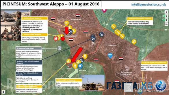 На южном фронте в г. Алеппо не прекращается ожесточенные бои. Сирийская армия, которая в понедельник, 1 августа, была вынуждена отступить после атак смертников и яростных обстрелов террористов, сейчас ведет наступление, вновь отвоевывая у бандформирований ранее потерянные позиции.
