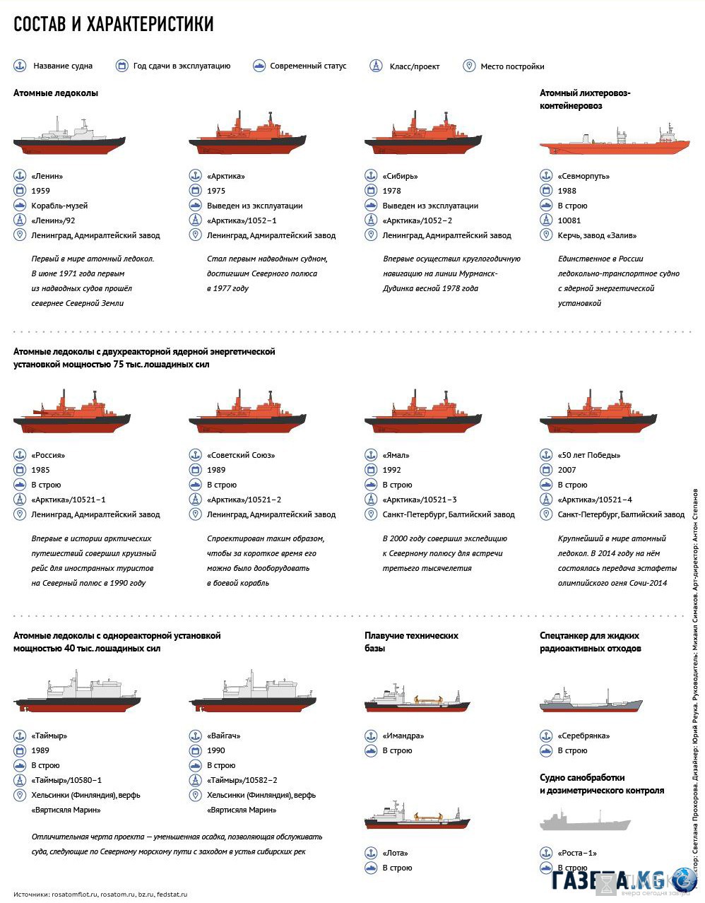 Почти все советские и российские ледоколы — дело рук корабелов «Адмиралтейских верфей» и Балтийского завода в Ленинграде. Лишь «речники» «Таймыр» и «Вайгач» были построены на финской верфи, а затем отправлены в Ленинград для установки реакторов.