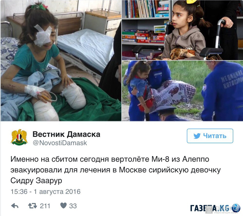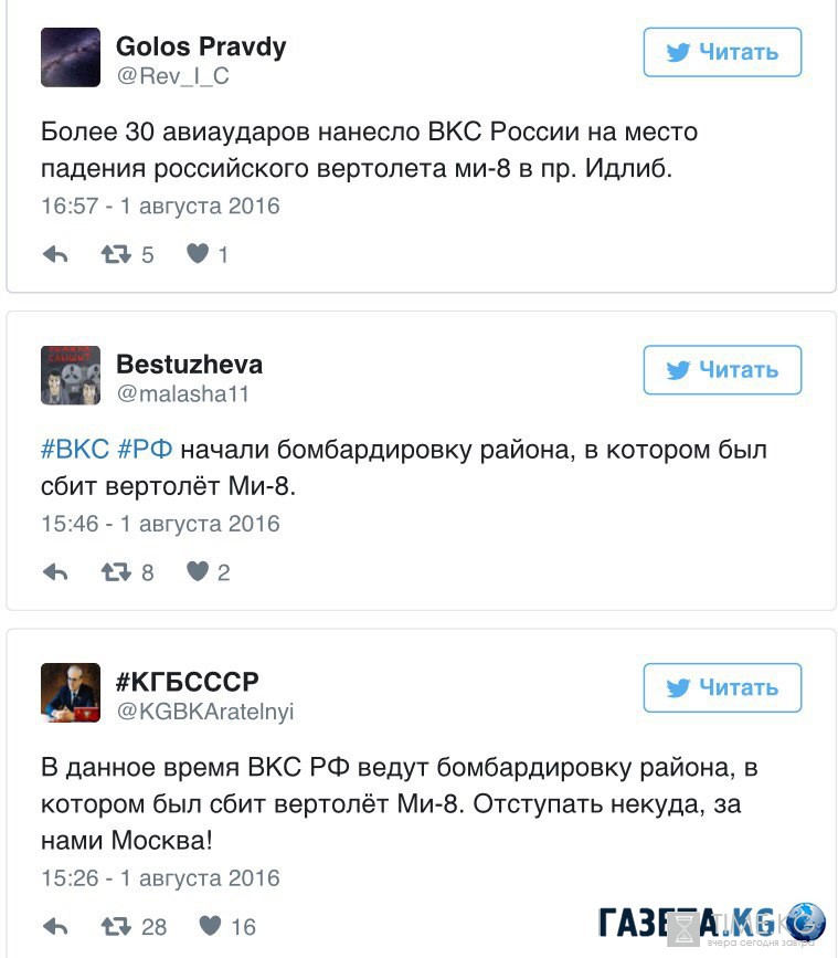 Сегодня в небе над Сирией был сбит российский военно-транспортный вертолет Ми-8, возвращавшийся на авиабазу Хмеймим из Алеппо, куда он доставлял гуманитарную помощь. На его борту находились три члена экипажа и два офицера российского Центра примирения враждующих сторон в Сирии.