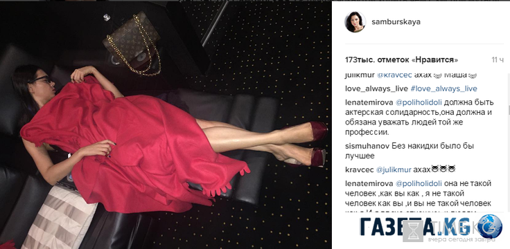 Самбурская выложила в сеть снимок из кинотеатра: актриса отправилась посмотреть фильм «Отряд самоубийц». После сеанса в Инстаграме актрисы появилось очередное фото, сделанное после просмотра картины. На нем Самбурская лежит на кожаном диване, прикрытая лишь красным пледом.