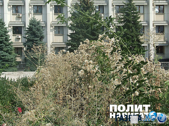 Видимо, чтобы как-то обозначить для себя, с какой стороны ходить на работу (а глядя на штаны Михо, становится понятно, что у него со сторонами глубокий психологический кризис), ряд входов не стали расчищать от мешков с песком, оставшихся со времен баррикад 2014 года. Но это-то ерунда. Клумбы в парке (а именно их наблюдают чиновники из своих окон), которые раньше смело можно было назвать не просто клумбами, а целым розарием, где весной художественно высаживали декоративные цветы, полностью загублены — на них колосятся метровые будяки, местами доходящие до человеческого роста.