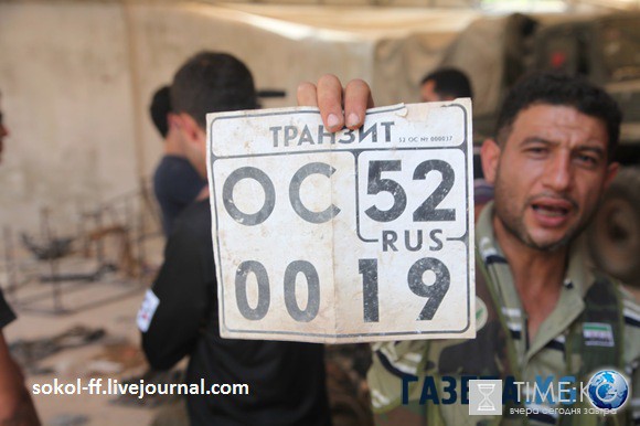 Боец ССА показывает номер с надписью «транзит», на русском языке, который был найден среди пустых ящиков из под боеприпасов и разной военной техники