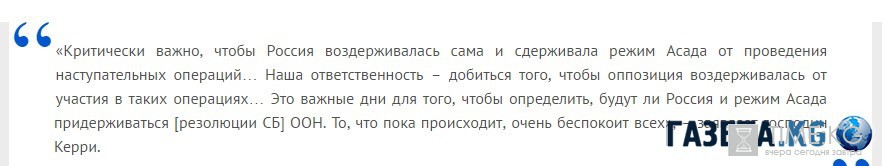 И далее: «Мы посмотрим в ближайшие часы, дни, может ли измениться такая динамика. Это очень сложно, когда обе стороны на местах больше хотят сражаться, чем выполнять обязательства в соответствии с резолюцией СБ ООН». Признание, что атаки проводит как правительство Сирии, так и [запрещённая в России террористическая – прим. авт.] группировка «Джебхат ан-Нусра», что приводит к «циклу, когда обе стороны выясняют, кто что начал» означает, что Вашингтон де-факто ставит сирийские власти и террористов на одну доску, отдавая явное предпочтение последним.