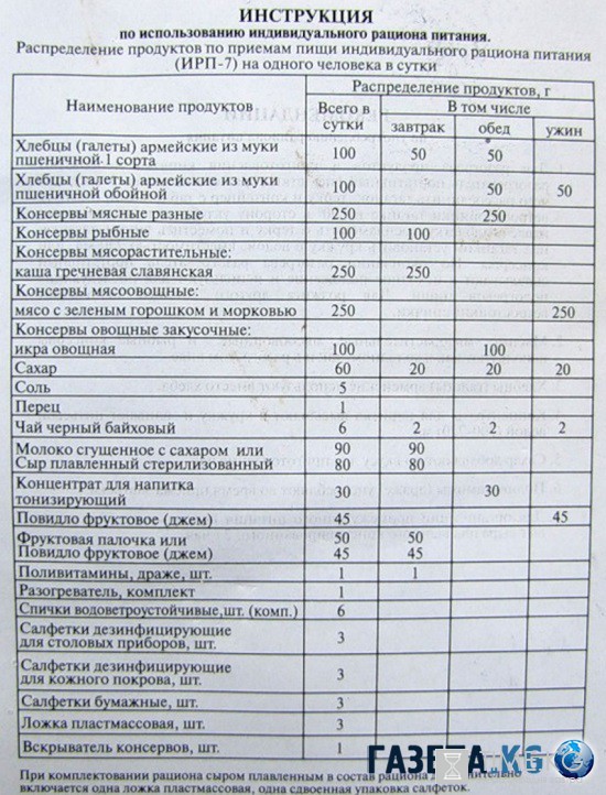 К набору идёт инструкция. Обратите внимание на проработку деталей для употребления ИРП-7. Хлебцы из муки 1 сорта идут только на завтрак и обед, а уже на ужин рекомендуется есть галеты из обойной муки. Рыба и гречневая каша с мясом идут на завтрак, мясные консервы — на обед. А поужинать можно мясом с зелёным горошком и морковью.