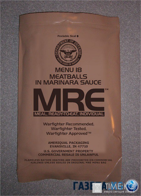 Сегодня самый популярный вариант индивидуального рациона питания в США — MRE, или Meal, Ready to eat. Есть 24 варианта такого меню. Ценность наборов — около 1200 килокалорий, весит набор до 750 граммов. Рассчитан паёк только на один приём пищи.