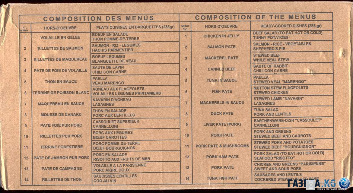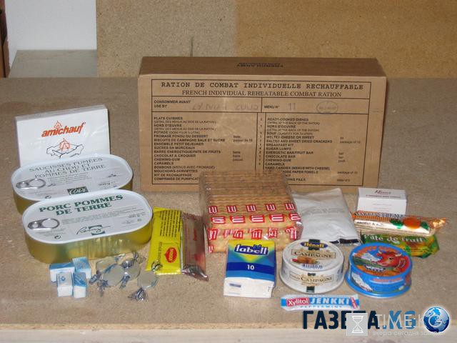 Во Франции, как и в России, стараются делать меню солдат разнообразным. Есть четырнадцать вариантов RCIR — “Ration de Combat Individuelle Rechauffable”, боевого рациона индивидуального разогреваемого. Энергетическая ценность продуктов в одном комплекте составляет 3200 килокалорий, набор рассчитан на питание одного человека в течение всего дня.