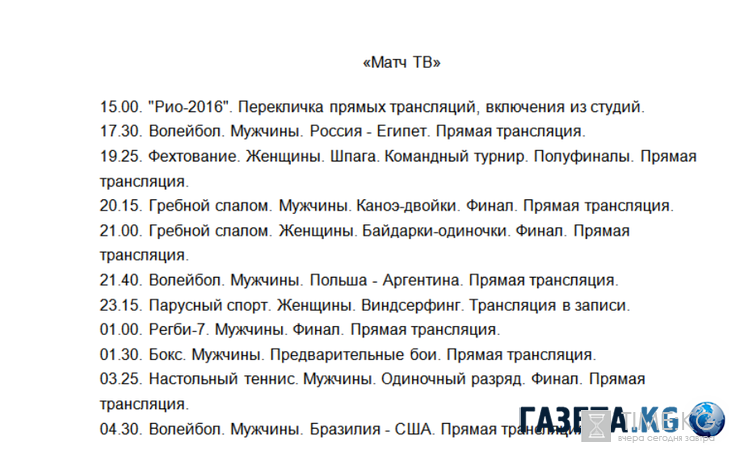 Расписание олимпиады на сегодня 11 августа: новости. Помимо трансляция собственно соревнований, в эфирах телеканалов можно отследить последние олимпийские новости по другим программам: так, на «1 канале» и ежечасно выходят «новости часа» и просто новостные блоки, которые рассказывают о самых свежих известиях из Рио, на телеканале «Россия 1» также достаточно просмотреть «Вести». На «Матче» спецвыпуски программы «Все на матч» выходят в эфир в течение всего дня: это телепередача не только делает обзор текущих новостей, но и приглашает на интервью интересных людей, призеров и победителей Олимпиады, рассказывает о интересных фактах из истории Олимпийского движения и т.д.