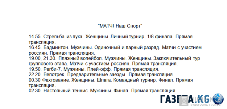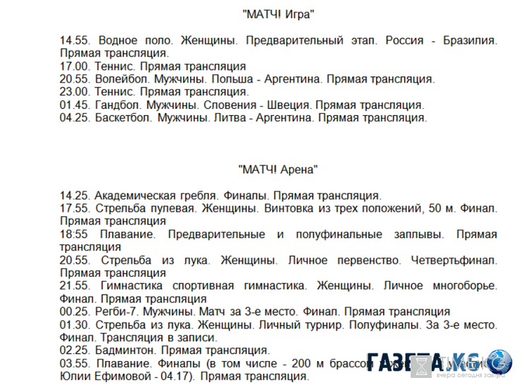 Расписание олимпиады на сегодня, 11 августа. По традиции, все федеральные и спортивные каналы ведут телетрансляции соревнований, как в прямом эфире, так и в записи. На 11 августа запланированы соревнования волейболу, гребному слалому, фехтованию, парусному спорту, регби, плаванию и другим популярным видам. Естественно, предпочтение отдается тем категориям, в которых участвуют россияне.