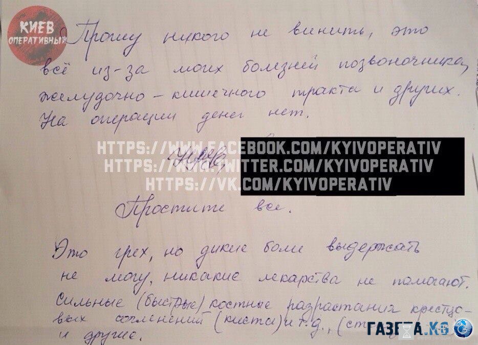 «Прошу никого не винить, это все из-за моих болезней позвоночника, желудочно-кишечного тракта и других. На операции денег нет», - написала она. - Это грех, но дикие боли выдержать не могу, никакие лекарства не помогают».