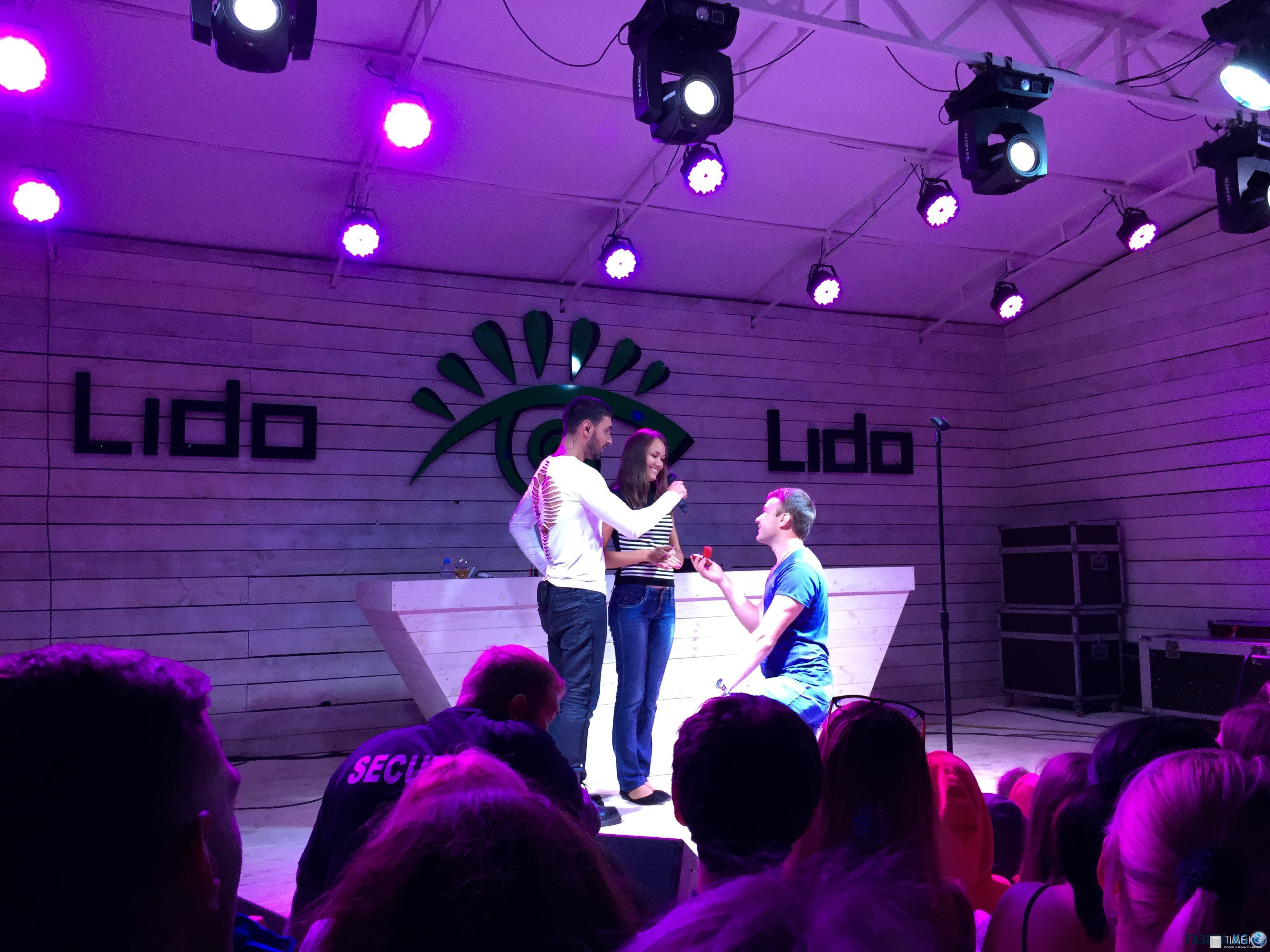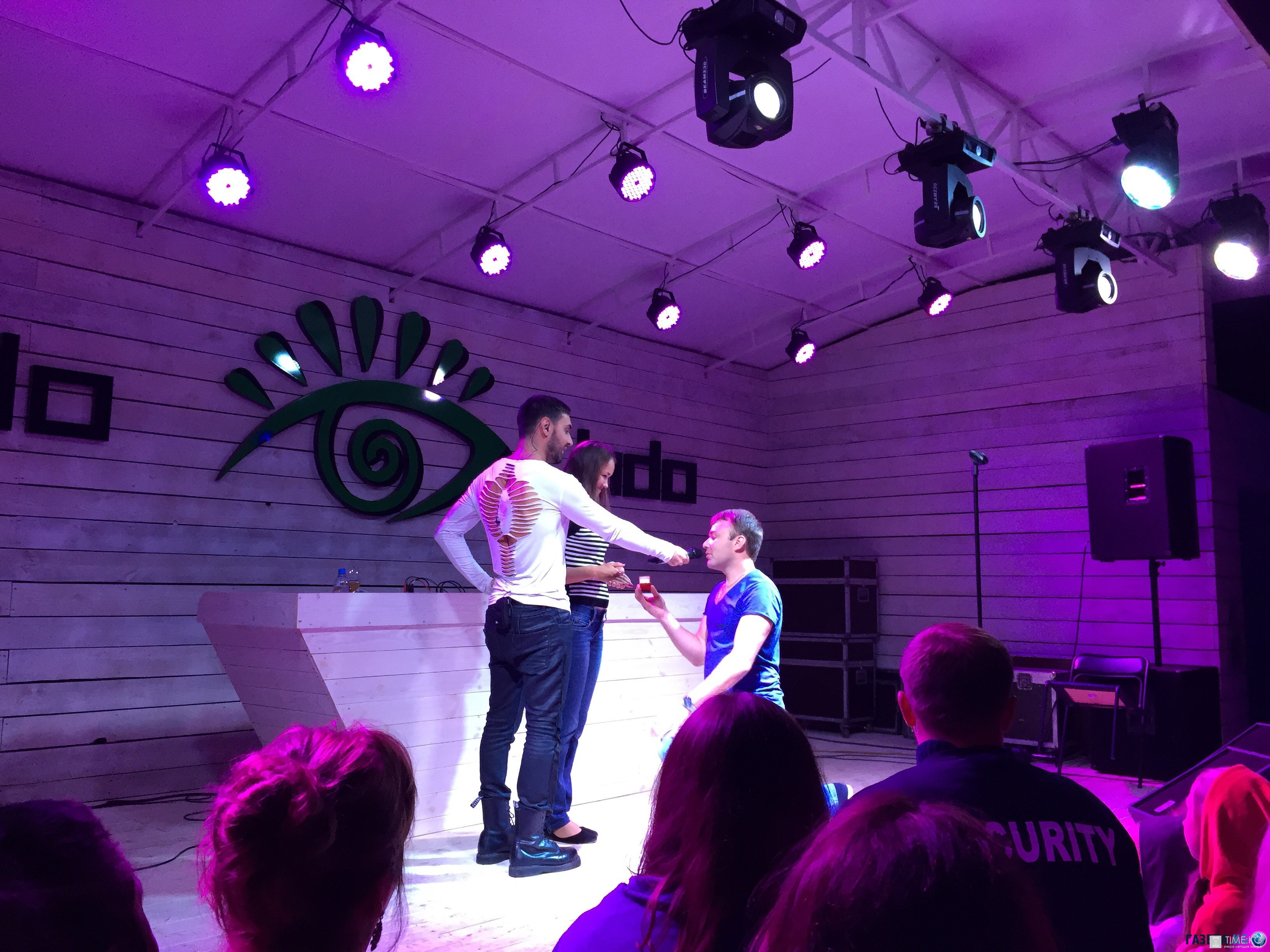 Реакция была настолько бурной, что Виталий предложил самому активному и смелому влюбленному человеку подняться к нему на сцену, чтобы оттуда во всеуслышание признаться в любви своей второй половинке.