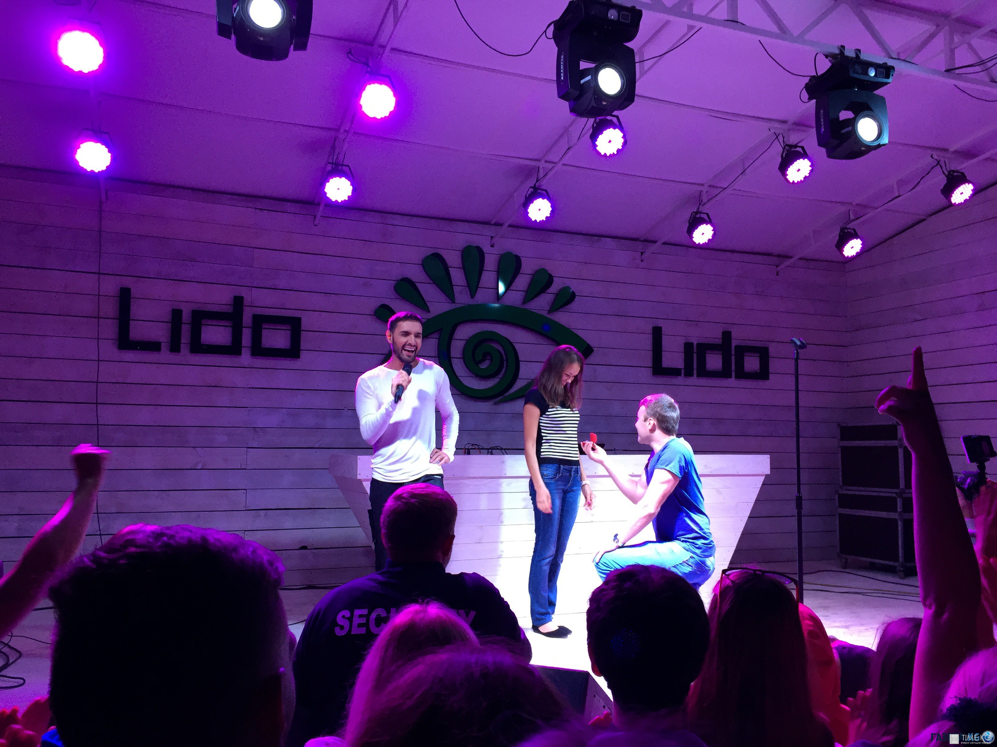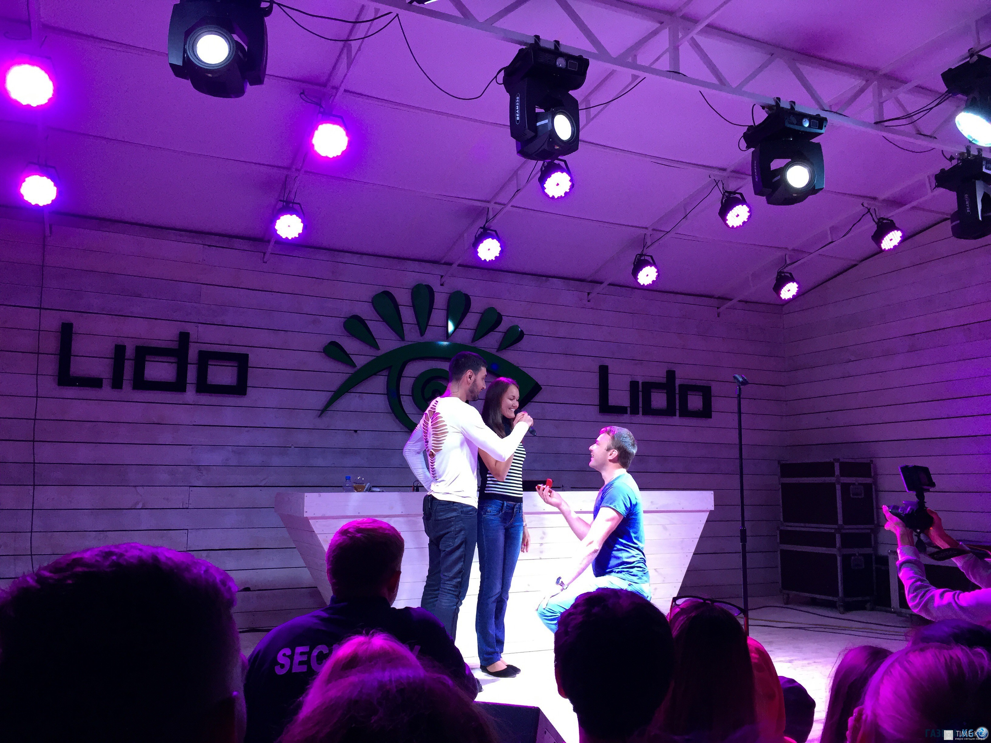 Среди смелых оказался молодой человек, который вышел вместе со своей девушкой, которая оказалась поклонницей Виталия, и после красивых слов о любви, встал перед ней на одно колено, достал коробочку с кольцом и сделал предложение руки и сердца. Девушка, подбадриваемая артистом, уверенно сказала «Да!»