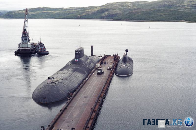 «Северсталь» проекта 941 и (маленькая такая, в уголочке) — многоцелевая АПЛ «Гепард» проекта 971 «Щука-Б»