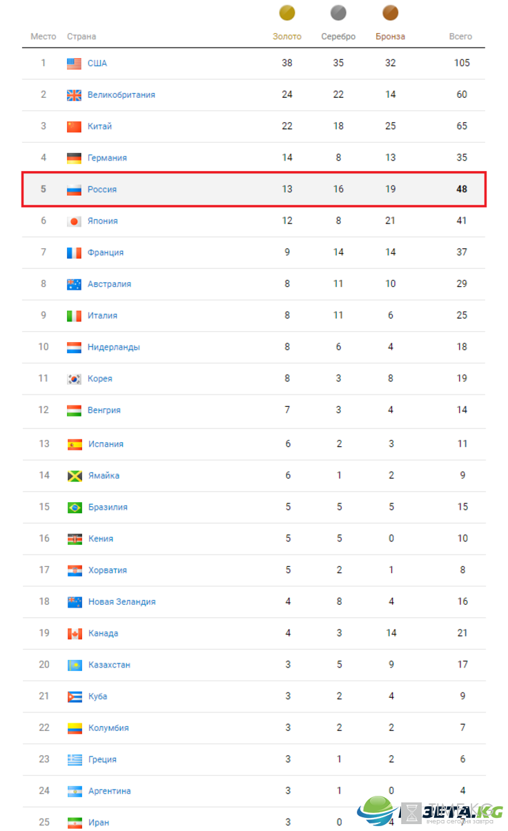Олимпиада 2016 медальный зачет: таблица на 20.08.2016