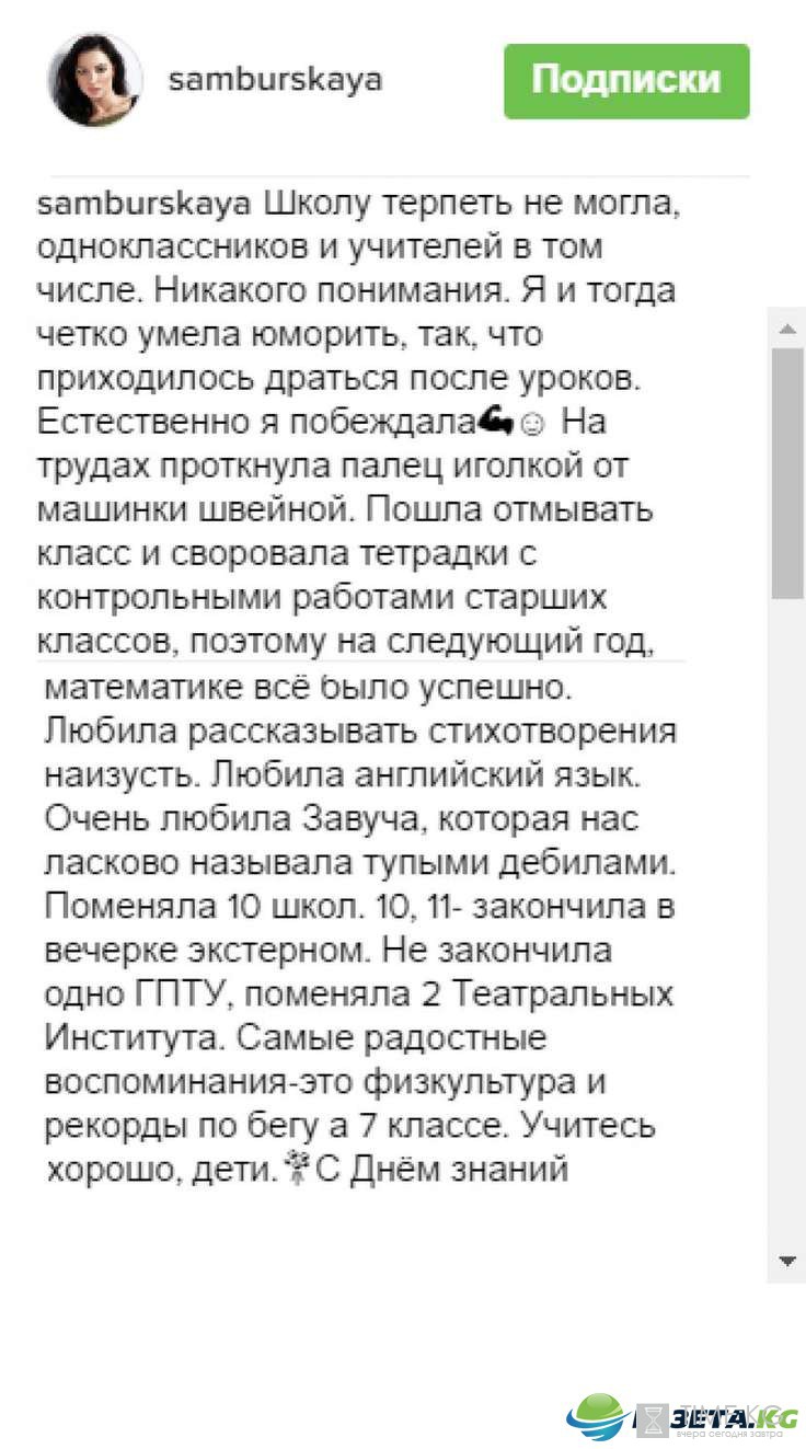 Известная своими неординарными выходками российская актриса Настасья Самбурская поделилась с подписчиками Инстаграм небольшим рассказом о ее школьном прошлом.