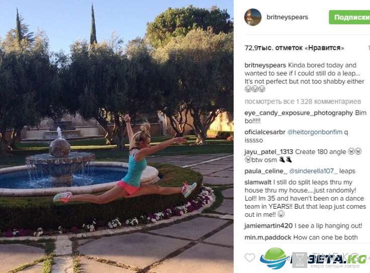 «Заскучала сегодня и захотела посмотреть – смогу ли я сделать прыжок… он неидеален, но и не слишком неудачен» - написала Бритни Спирс пояснение к фото. Подписчики не заметили каких-либо изъянов в шпагате и восторженно похвалили певицу и её спортивное тело. Но особо внимательные фолловеры заметили одну пикантную особенность фотографии – прыжок Бритни показал, что под короткими шортами отсутствует бельё.