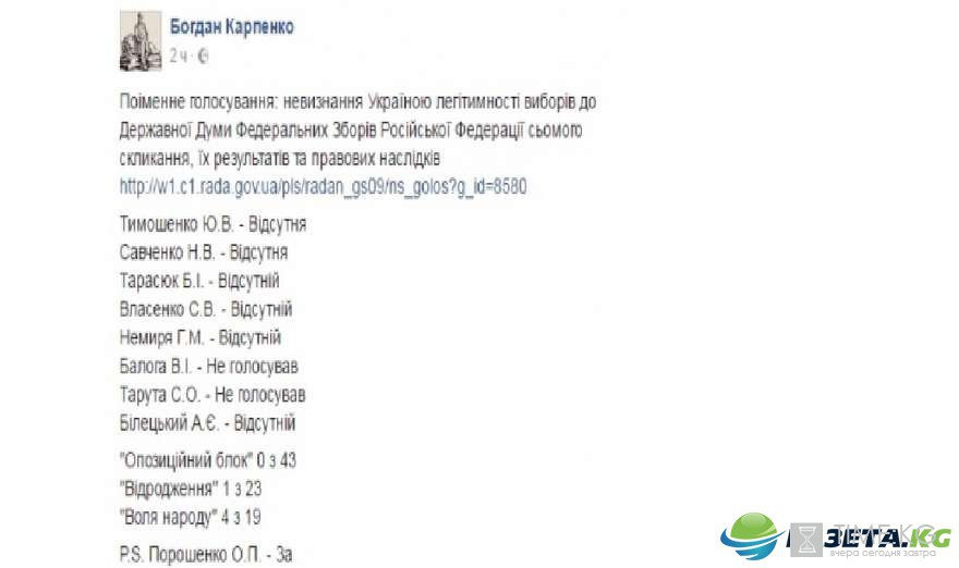 В Верховной Раде, принялось единогласное решение о непризнании действительными выборы в Госдуму России. Надежда Савченко и Сергей Тарута не были на голосовании, однако, главная «зрада» прилетела со стороны Юлии Тимошенко. Она просто отказалась отдавать свой голос за непризнание выборов. Богдан Карпенко, который является советником президента "незалежной", разместил на своей странице в соцсети список предателей. Все, кто не проголосовал, отсутствовали в зале заседания, однако, Юлия Тимошенко была на тот момент там и все равно не проголосовала.