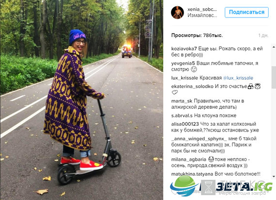 Ксения выложила в сеть видео, где она катается на самокате по Измайловскому парку в довольно странном желто-фиолетовом салопе и тапочках, уже засветившихся на одной из фото в соцсети.