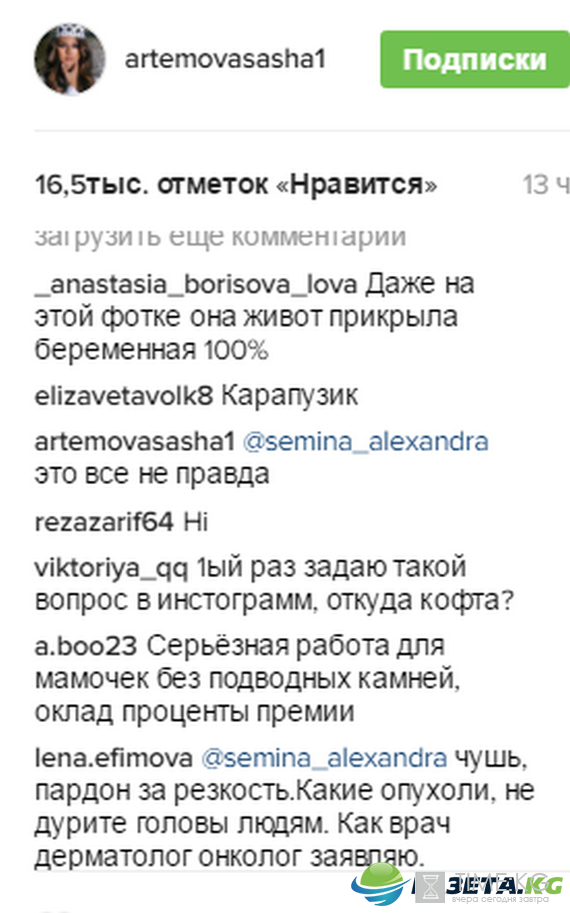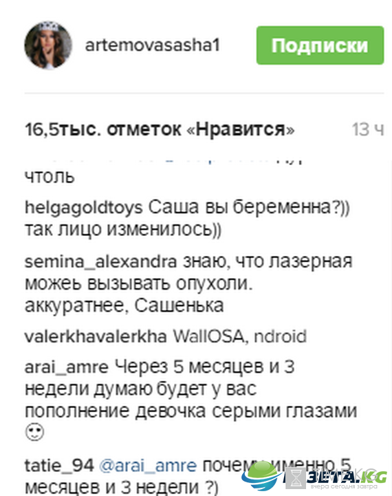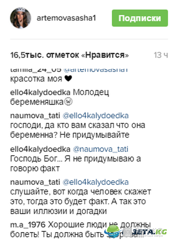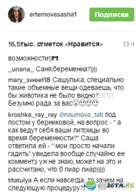 Стоит напомнить, что какой бы бьюти-пост Артемова не выложила, всегда находятся смельчаки пообсуждать беременна она или нет. Даже прогноз сделали, через какое время ведущая родит девочку с серыми глазами. «Молодец, беременяшка», «Господи, да кто вам сказал, что она беременна? Не придумывайте», «Господь Бог... Я не придумываю, а говорю факт», «Слушайте, вот когда человек скажет это, тогда это будет факт. А так это ваши иллюзии и догадки», «Хорошие люди не должны болеть! Ты должна быть здорова!», «Саня, беременна?», «Сашулька, специально такие объемные вещи одеваешь, чтобы животика не было видно? Безумно рада за вас», «Под постом у Берниковой, на вопрос:«А как ведут себя ваши питомцы во время беременности?», Саша ответила ей: «Мои просто начали гадить». Увидела вообще случайно ее коммент, уж не знаю, может на это и рассчитано, чтоб пиар, пиар», «А если навсегда, то зачем на следующую процедуру?», «Даже на этой фотке она живот прикрыла, беременная 100%», «Карапузик», «Это все не правда», «Саша, вы беременна? Так лицо изменилось», «Через 5 месяцев и 3 недели, думаю, будет у вас пополнение - девочка с серыми глазами», «Почему именно 5 месяцев и 3 недели?».