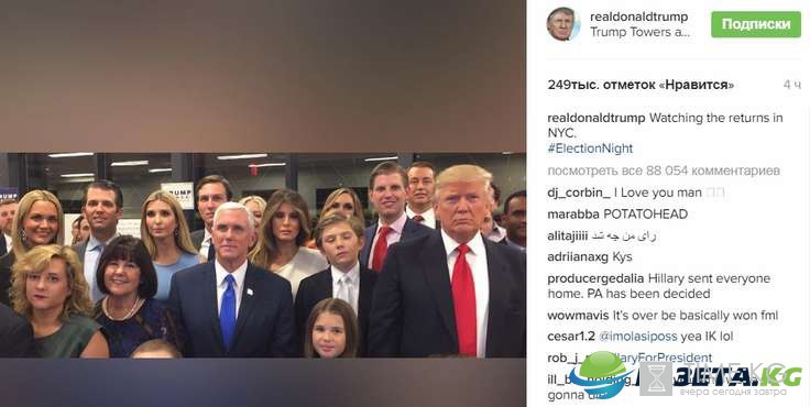 Трамп стал президентом США, лидируя в большинстве штатов. Миллиардер 70-летнего возраста (от республиканской партии) жёстко противостоял экс-госсекретарю Хиллари Клинтон (партия Демократов). Нынешняя избирательная кампания оказалась самой скандальной, бурной и непредсказуемой. За Трампа проголосовало большинство в следующих штатах: Пенсильвания, Аляска, Мичиган, Айова, Джорджия, Индиана, Вашингтон, Аризона, Невада, Флорида, Юта, Северная Каролина, Айдахо, в американском посольстве в Сеуле.