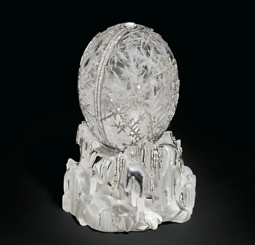 Яйцо расположено на основании из горного хрусталя, стилизованном под тающий лед.