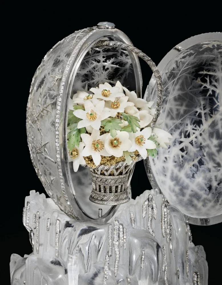 Это яйцо, выполненное из горного хрусталя, обладает внутренней гравировкой, напоминающей иней, и внешним декором в виде платиновых снежинок.