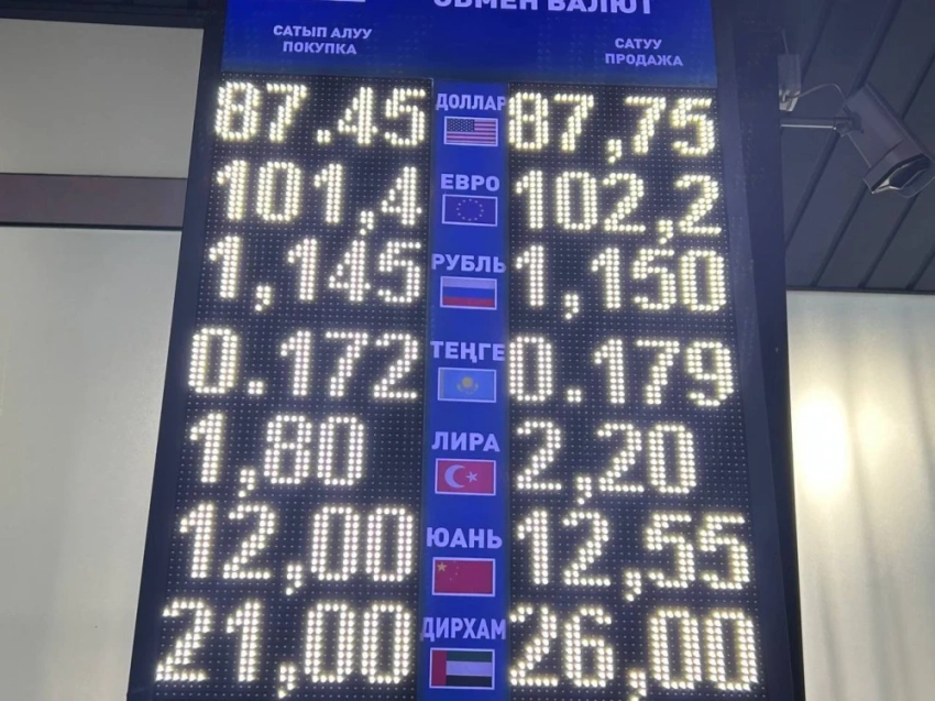 Курс доллара возрос: его покупают по 87,45 сома, а продают по 87,75.