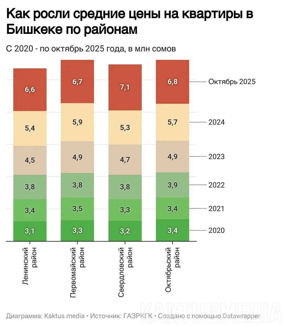 Согласно данным за октябрь, средняя цена квартир в Свердловском районе составляет 7 млн сомов, в Октябрьском - 6,8 млн сомов, в Первомайском - 6,7 млн сомов, а в Ленинском - 6,6 млн сомов.alt="Как меняются цены на жилье в Бишкеке: анализ ситуации на рынке квартир"