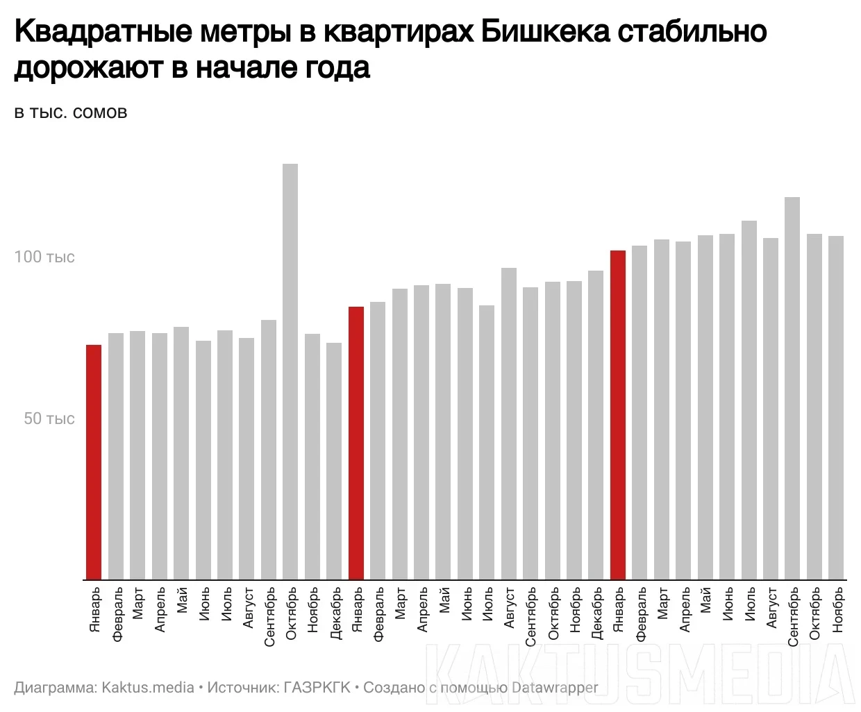 В текущем году цена квадратного метра жилья в Бишкеке возросла на 15%. С ноября прошлого года, когда стоимость составляла 92 635 сомов, сейчас она достигла 106 607 сомов, согласно данным Госагентства по земельным ресурсам, кадастру, геодезии и картографии (ГАЗРКГ). Однако за последние два месяца в столице произошло снижение цен на квадратный метр после пиковых значений, зарегистрированных в сентябре.По словам эксперта по недвижимости Пазылджана Илимова, "цены увеличивались с начала года, но темпы роста не такие высокие, как в прошлом году".